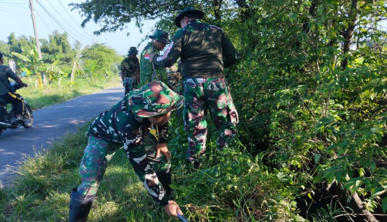 Karya Bakti Mitigasi Bencana, Koramil Rayon 3 Kodim 0815/Mojokerto Bersihkan Sungai di Payungrejo