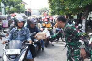 Dari pantauan di lapangan, Prajurit Kodim 0815 dengan sigap dan ramah membagikan nasi kotak kepada para pengendara motor, tukang becak, petugas kebersihan, hingga pedagang pasar. Antusiasme warga terlihat dari senyuman tulus dan ucapan terima kasih yang mereka sampaikan saat menerima paket makanan. Suasana berlangsung hangat, penuh keakraban, dan menunjukkan kedekatan nyata antara TNI dan rakyat.