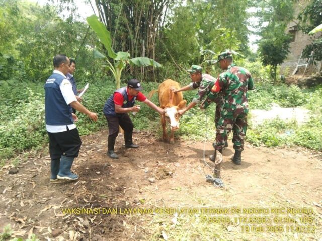 Mojokerto, wartakum7.com. – Sebagai langkah antisipasi penyebaran Penyakit Mulut dan Kuku (PMK) pada hewan ternak sapi dan kambing, Babinsa Ngoro Koramil 0815/12 Ngoro Kodim 0815/Mojokerto Serda Choirul Huda dampingi kegiatan vaksinasi pada hewan ternak di Desa Ngoro, Kecamatan Ngoro, Kabupaten Mojokerto, Jawa Timur, Rabu (19/2/2025).