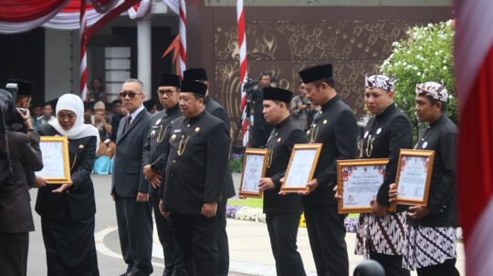 Mojokerto, wartakum7.com. – Kabupaten Mojokerto kembali meraih prestasi di tingkat provinsi, kali ini di bawah kepemimpinan Muhammad Albarraa, Bumi Majapahit menyabet tempat kedua pada Penyelenggaraan Nama Rupabumi Tingkat Provinsi Jawa Timur. Penyerahan penghargaan tersebut dilaksanakan secara langsung oleh Gubernur Jawa Timur Khofifah Indar Parawansa, pada upacara peringatan Hari Jadi Jawa Timur yang ke-80, Minggu (12/10) pagi.